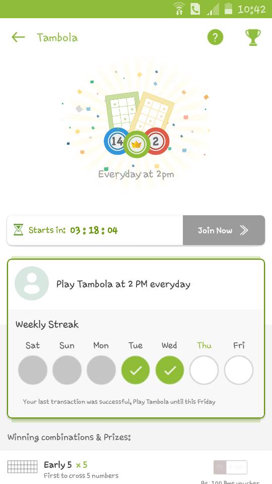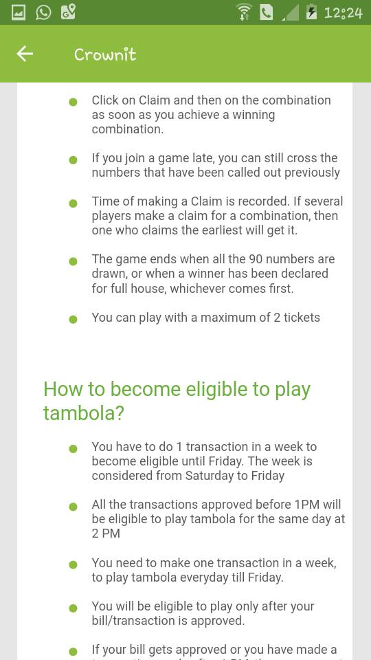 Along with them most fun and exciting activity is Tambola/Housie. Everyday I sticked to this app at 2.00 p.m for this activity.It start every day evening 2 pm and close when all tasks completed and full housie done by any user.Before to play the game we need ticket to play this game.This ticket can be obtained when you upload any bill for any activity in their app you automatically get this ticket.Using this ticket we need to buy a entry ticket before starting the game.App generates Automatic entry ticket(Housie ticket with some numbers). Exactly at 2 pm on the Tambola screen show random number and we need to strike it off on our ticket numbers.